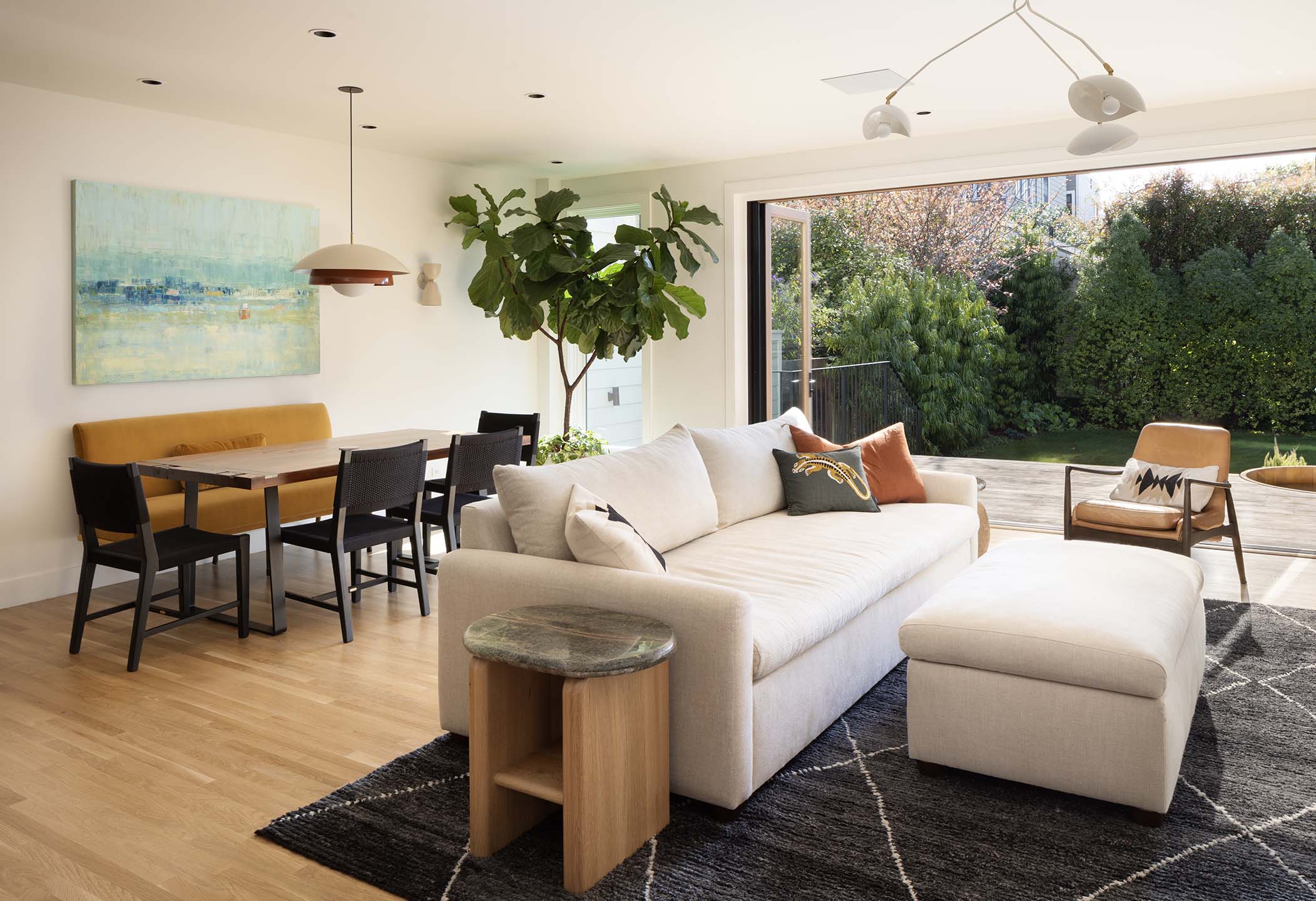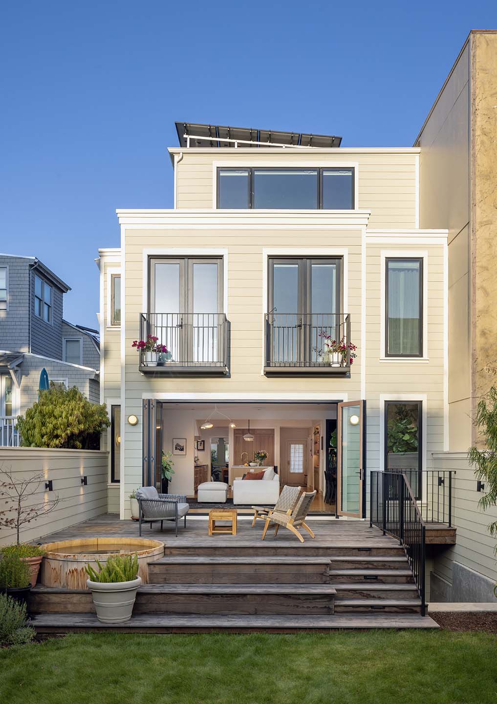 The backyard was redesigned as an extension of the main living spaces, with direct access from the interior, a new deck, and a hot tub and creates a seamless indoor-outdoor experience suited to everyday family life and entertaining alike.