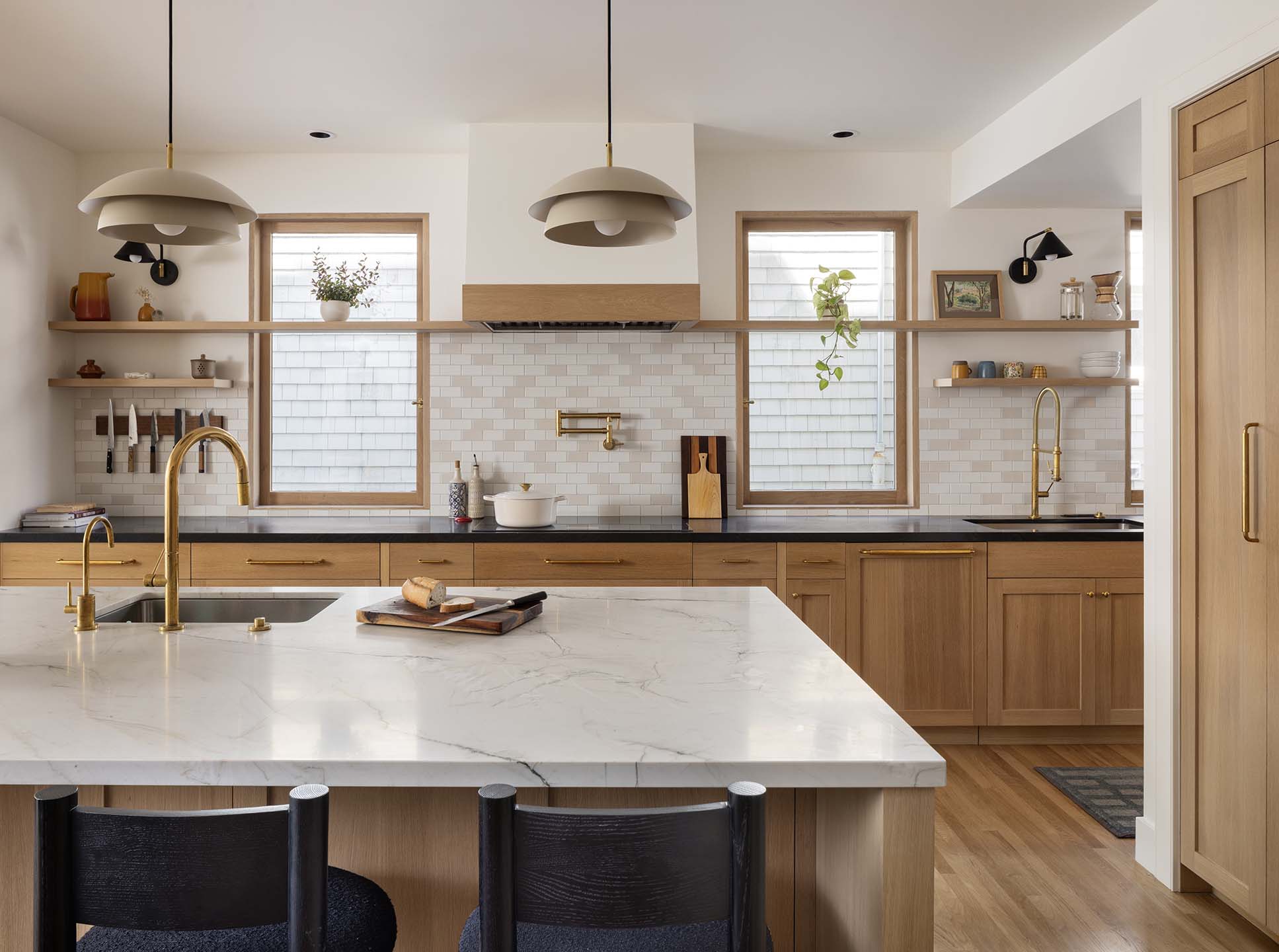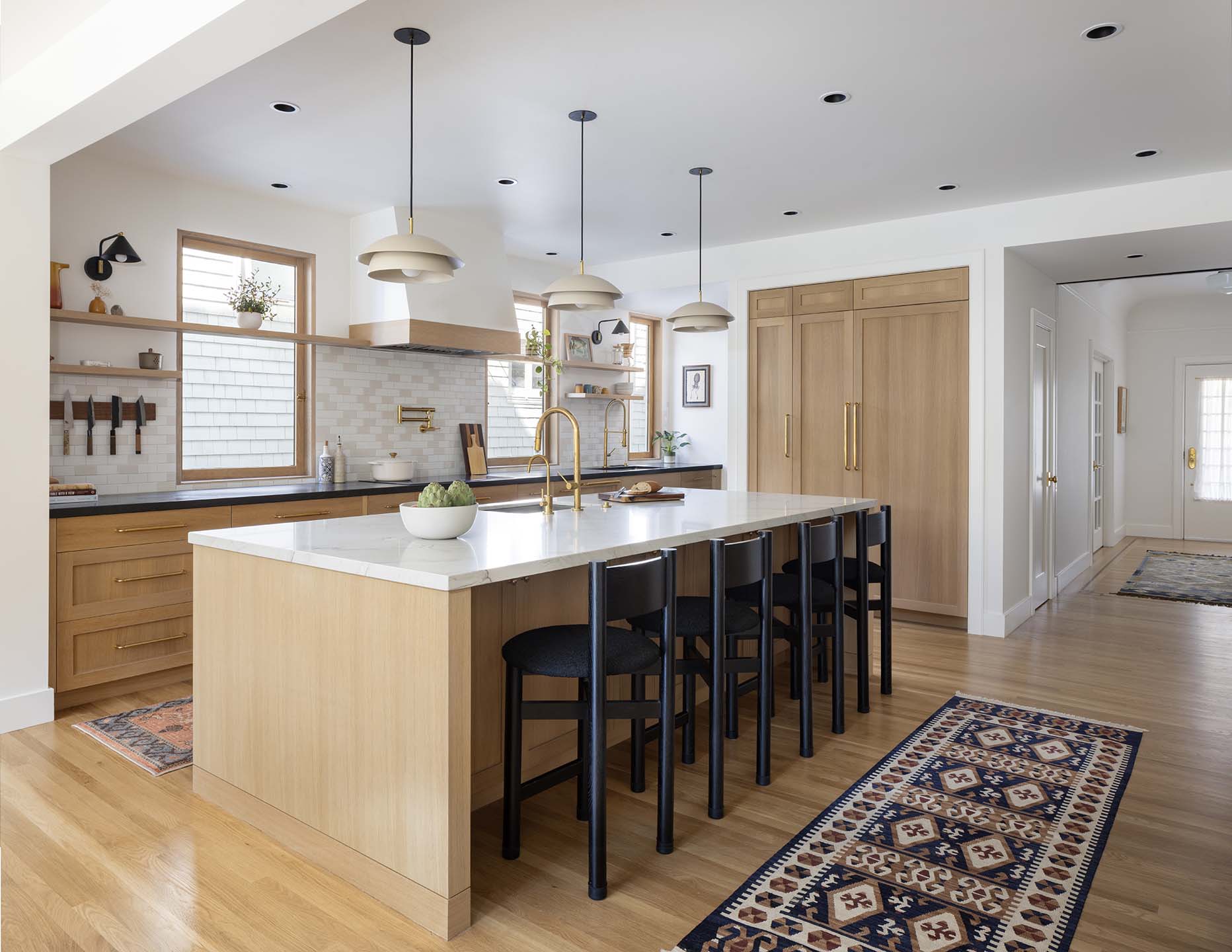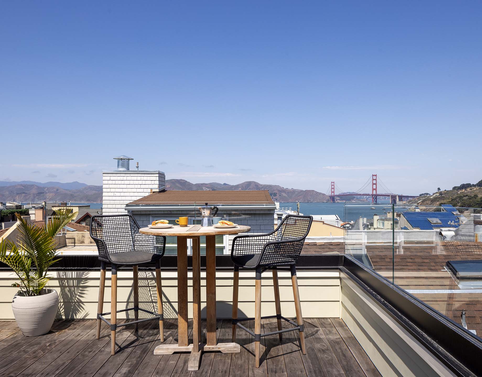 The historic front elevation remains intact, maintaining its character from the street, while a new third level adds valuable space and frames views of the Golden Gate Bridge. Inside, the home has been reconfigured to improve flow and functionality. The kitchen was redesigned from a cramped, outdated layout into a bright and efficient central gathering space. Opening up the rear elevation brings natural light deep into the home and strengthens the connection to the outdoors.